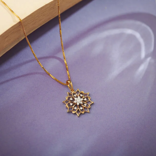Catch all the compliments with the alluring web of gold and diamonds of this pendant. Bedazzle everyone at grand occasions with this pendant as your accessory. The chain in the image is for representative purpose only and the actual product comes without a chain.